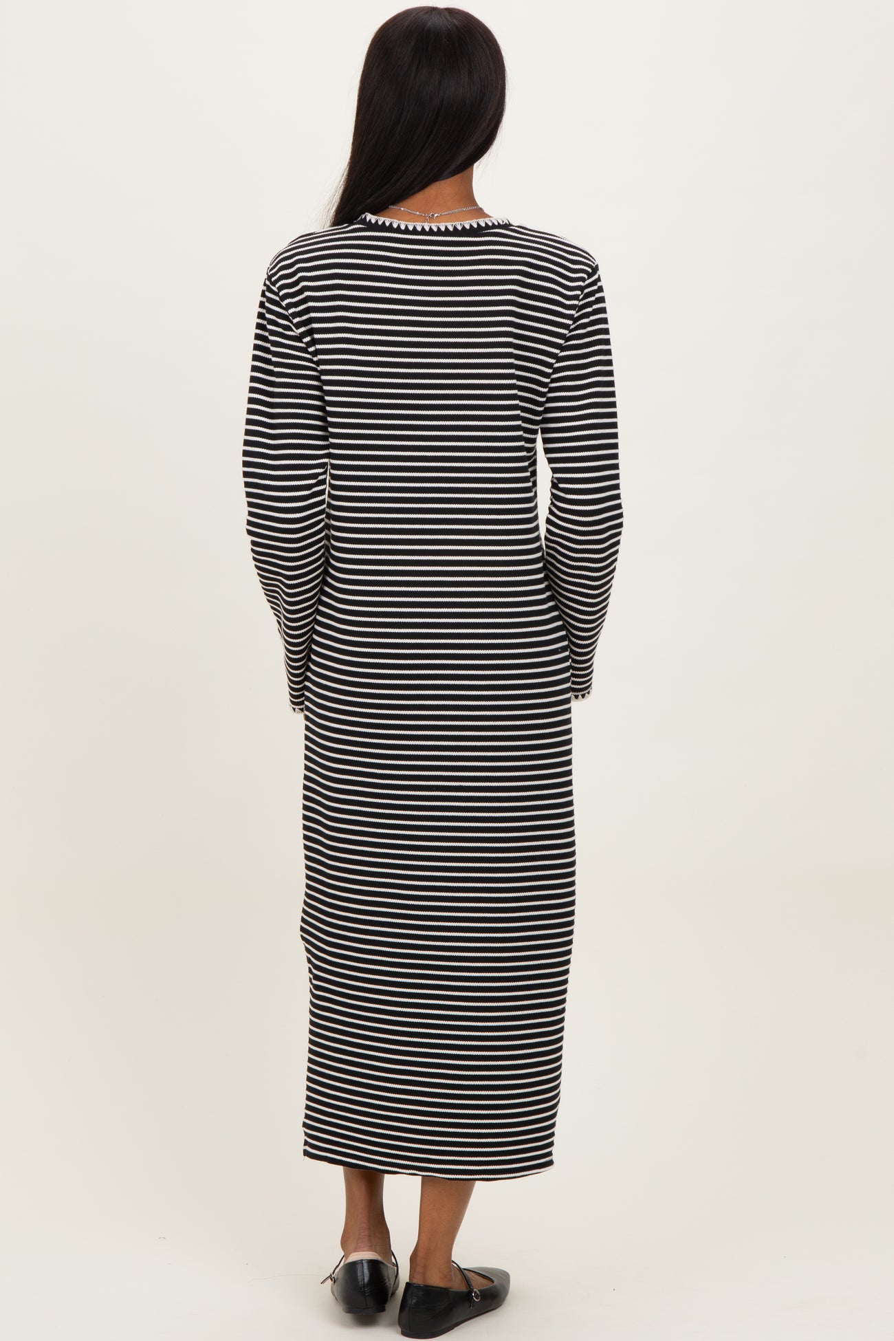 Black Striped Stitch Detail Long Sleeve Midi Dress