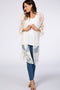 A chiffon maternity cover up featuring a swiss dot texture, 3/4 bell sleeves, and an open front.