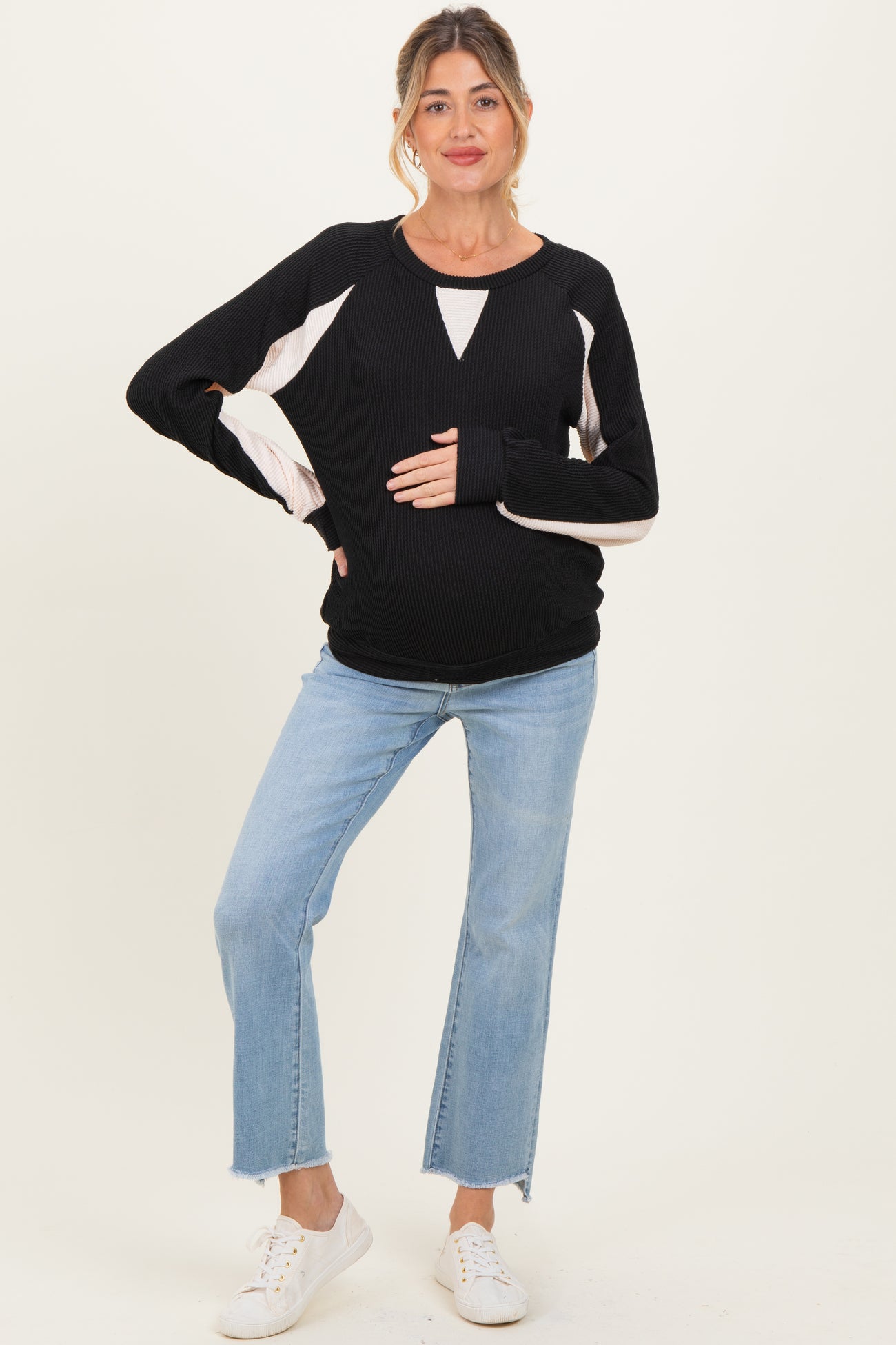 Stay cozy and stylish with our Black Textured Rib Colorblock Maternity Pullover. Crafted from soft, breathable fabric, this pullover features a flattering textured rib design and eye-catching colorblock accents on the sleeves and neckline. Designed with your growing bump in mind, it offers a relaxed fit and stretch for all-day comfort. Perfect for casual outings or layering on cooler days, pair it effortlessly with your favorite jeans or leggings. Elevate your maternity wardrobe with this versatile, chic pullover that combines comfort and contemporary style in one must-have piece.