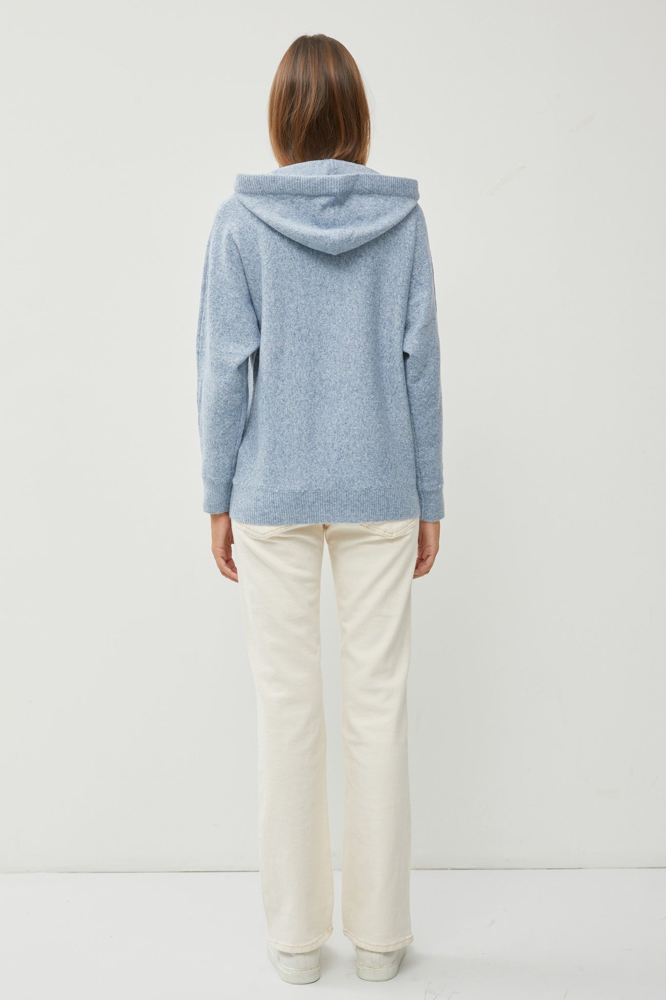 A soft knit sweater featuring an adjustable drawstring, a hood and long sleeves.