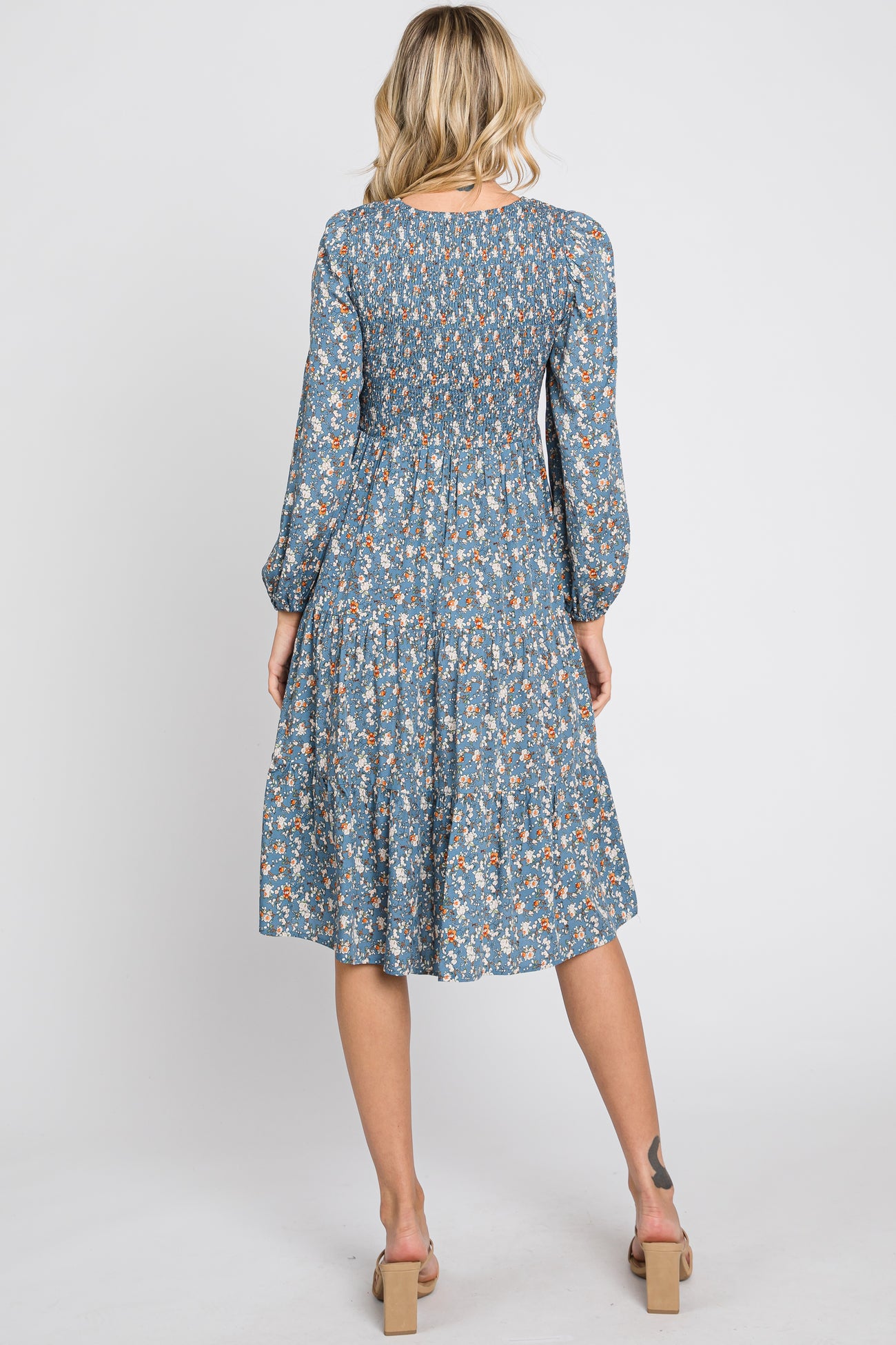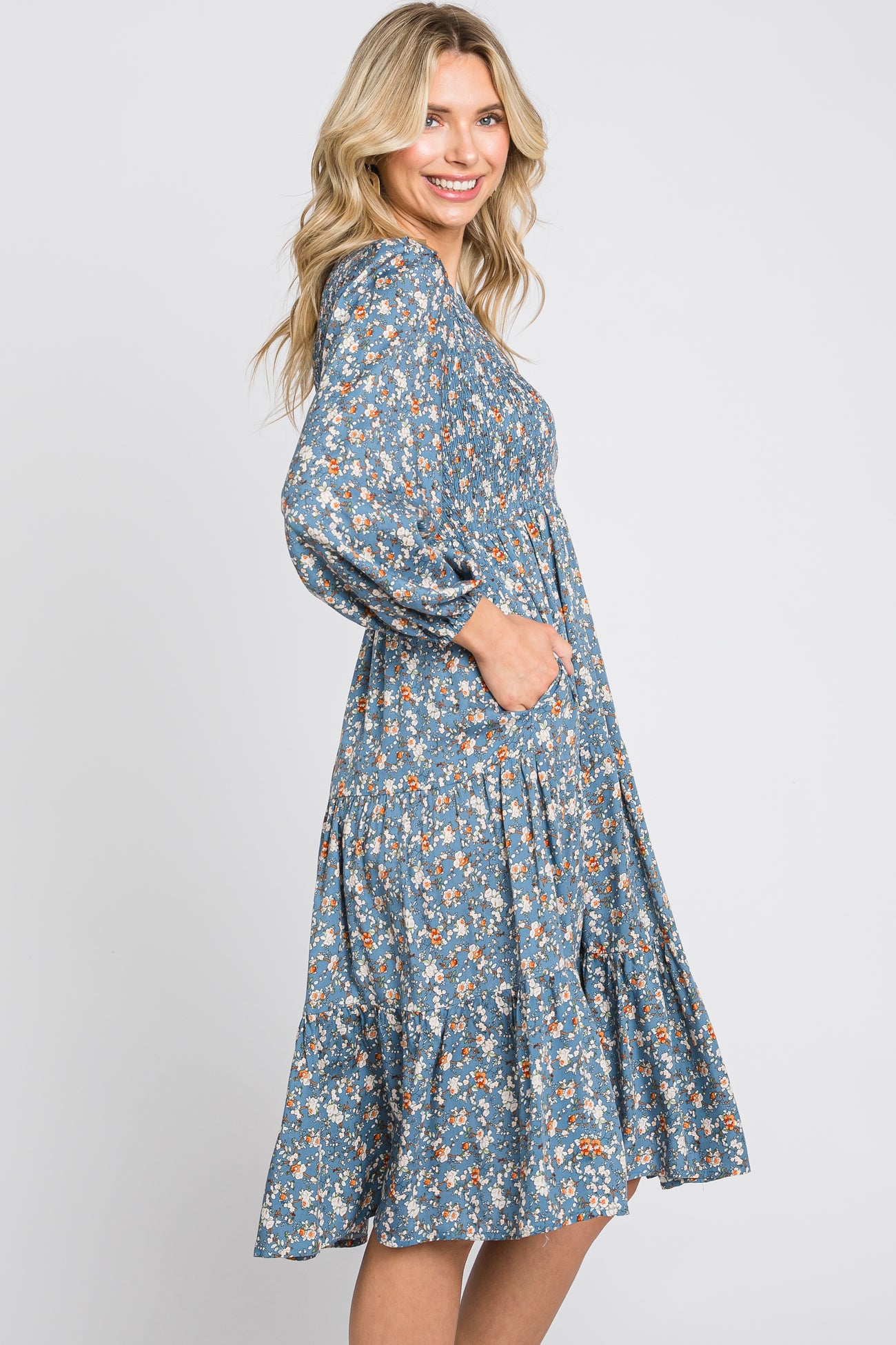 Blue Floral Smocked 3/4 Sleeve Tiered Midi Dress