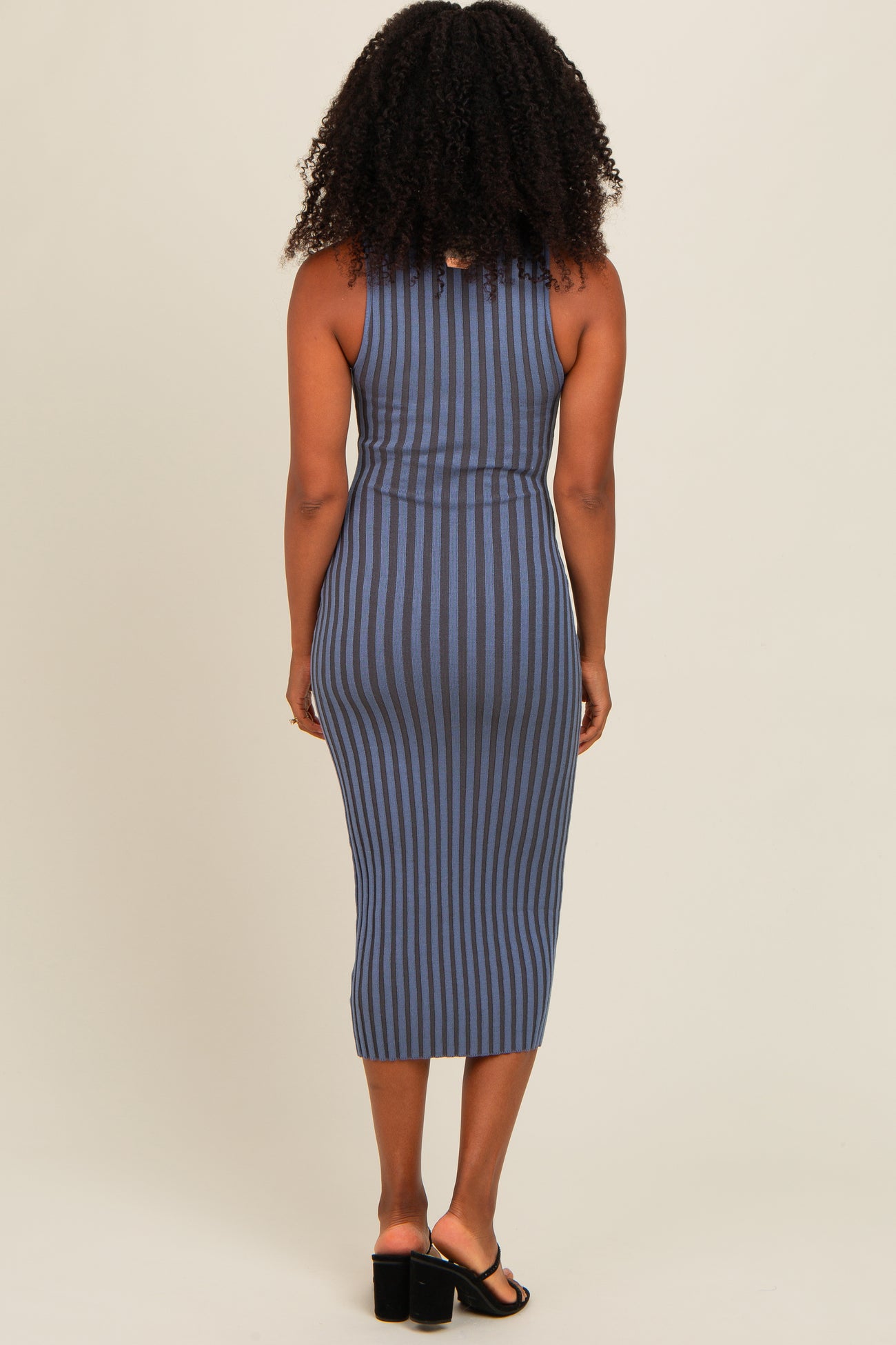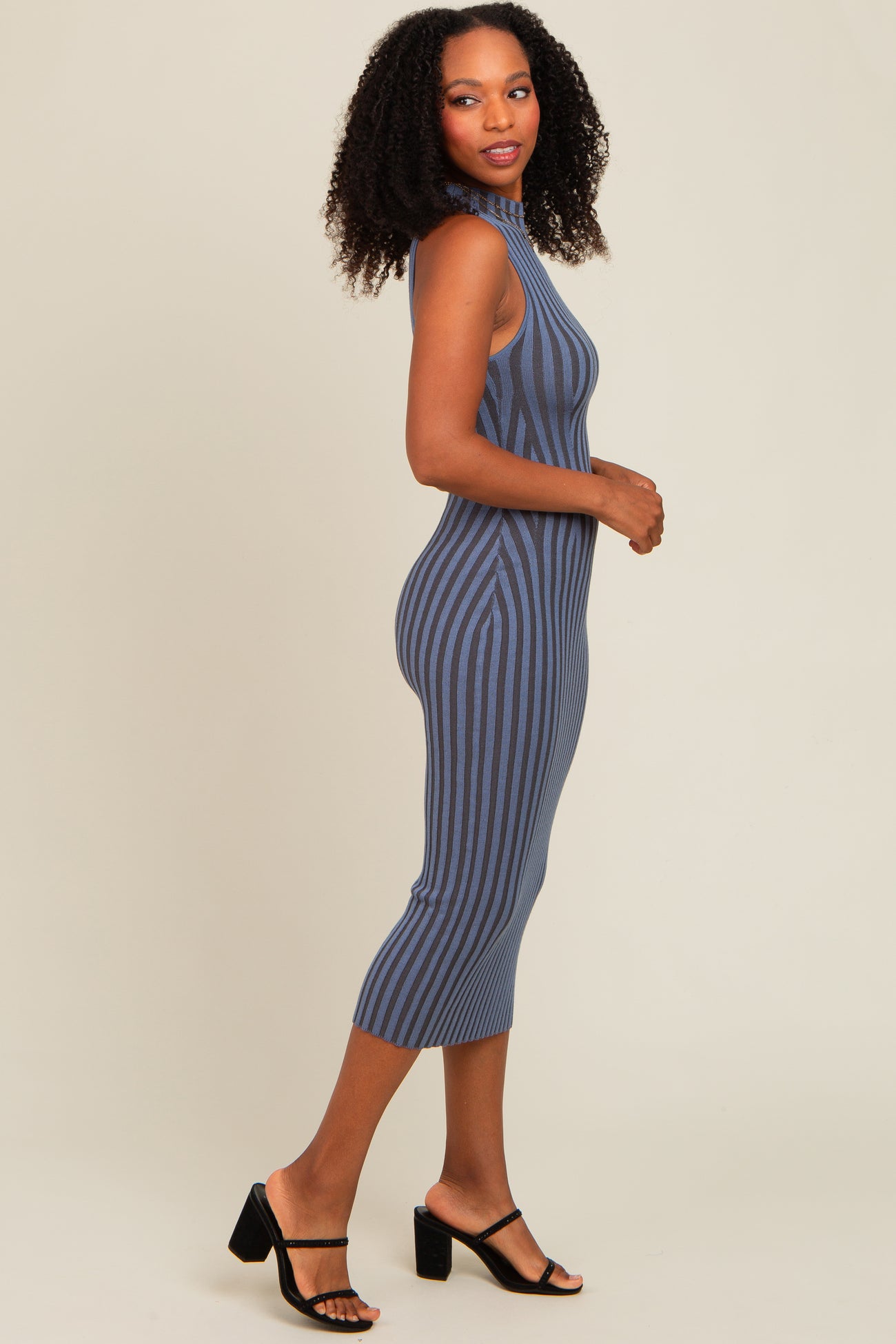 Blue Ribbed Knit Mock Neck Fitted Dress
