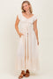 A mesh maxi dress featuring a ruffled tiered skirt, a smocked top, short flutter sleeves and a square neckline.