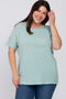 A solid hued plus maternity top featuring short sleeves and a rounded neckline.