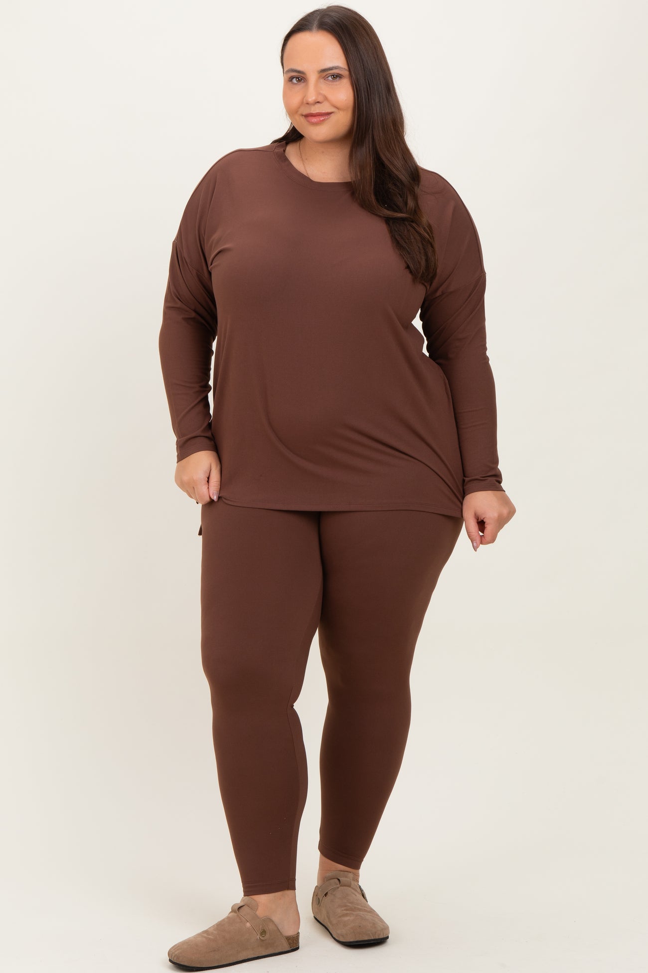 Brown Brushed Knit Oversized Top and Legging Plus Set