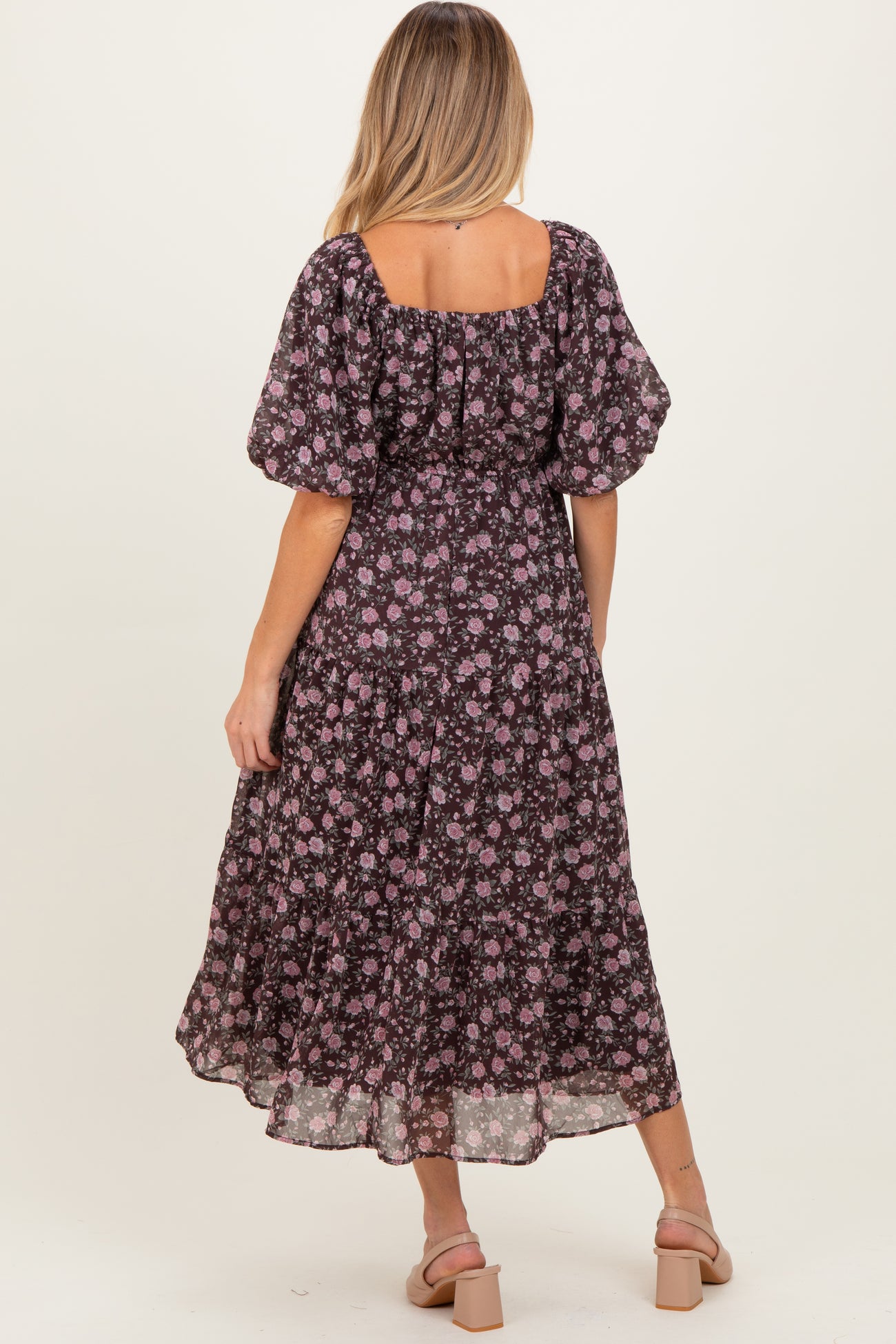 Brown Floral Sweetheart Neckline Puff Sleeve Maternity Maxi Dress