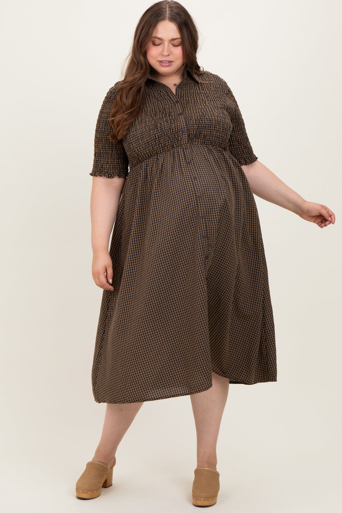 Brown Gingham Smocked Button Down Maternity Plus Midi Dress