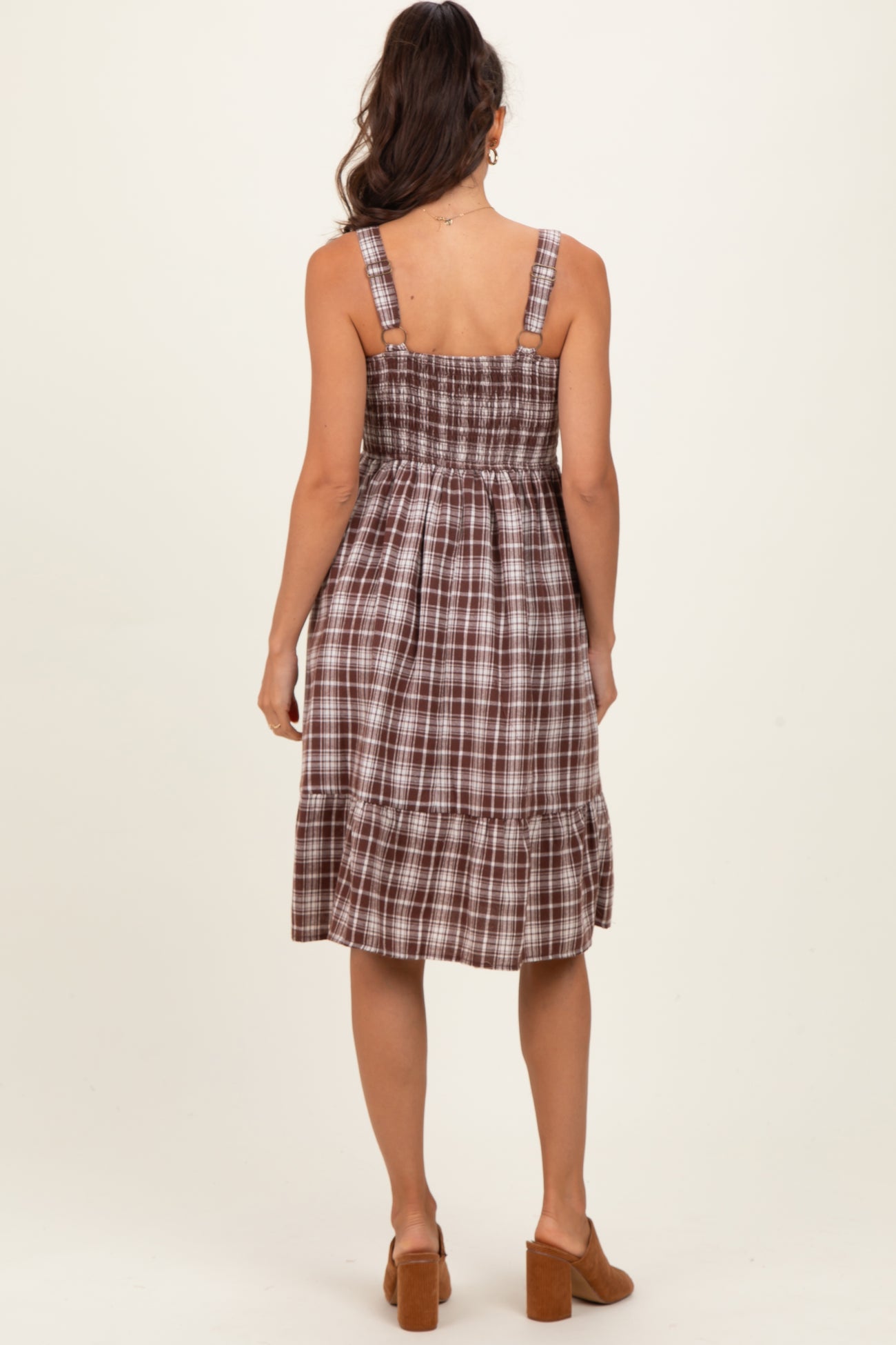 Elevate your everyday style with this Brown Plaid Square Neck Dress, a perfect blend of comfort and classic charm. Featuring a flattering square neckline and subtle button detailing on the bodice, this dress exudes effortless elegance. Crafted from soft, breathable fabric, it offers a relaxed fit with a tiered skirt that adds a playful touch. The adjustable straps and side pockets enhance both style and functionality. Ideal for casual outings, brunch dates, or weekend getaways, pair it with your favorite sandals or ankle boots for a chic, laid-back look. Embrace timeless style with this versatile plaid dress!