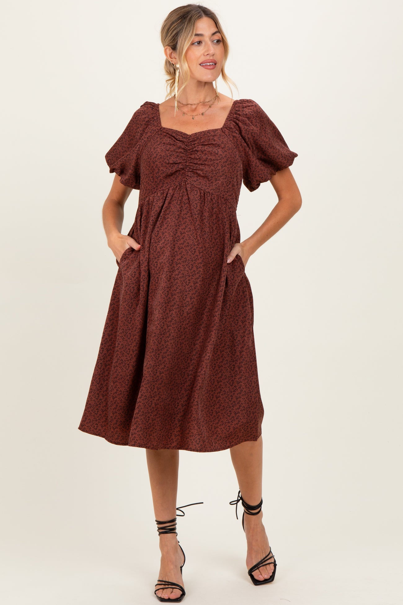 Elevate your maternity wardrobe with this Brown Ruched Sweetheart Neck Maternity Dress. Featuring a flattering ruched sweetheart neckline and puff sleeves, this dress beautifully balances comfort and style. Crafted from soft, breathable fabric, it provides gentle stretch to accommodate your growing bump. The flattering empire waist flows into a midi-length skirt for an effortlessly elegant silhouette. Designed with practical side pockets and a timeless brown print, it’s perfect for casual days or special occasions. Pair with heels or flats for versatile, chic maternity wear you’ll love.