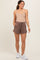 A pair of solid terry maternity shorts featuring side pockets and an elastic drawstring waist.