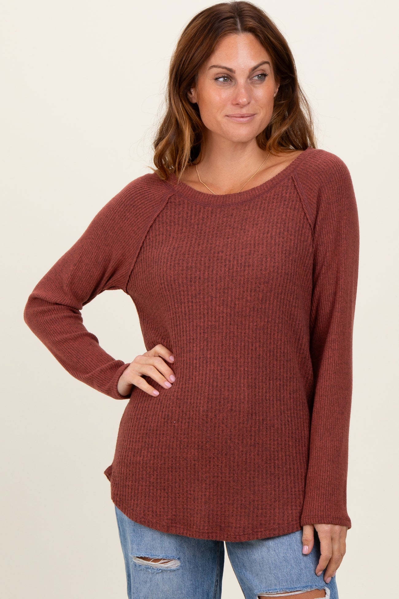 Brown Waffle Knit Raglan Long Sleeve Maternity Top