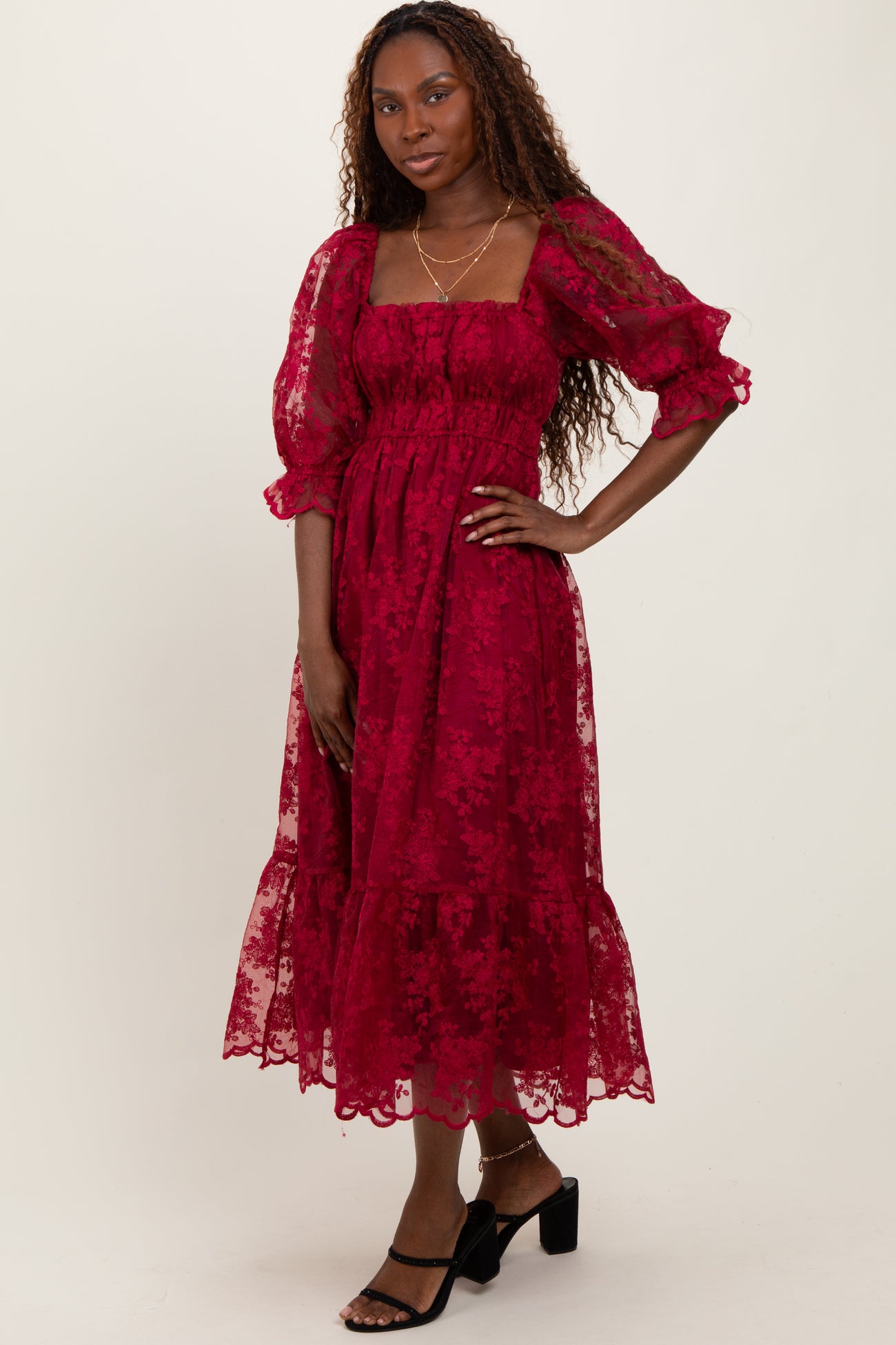 Burgundy Floral Mesh Lace Overlay Maxi Dress