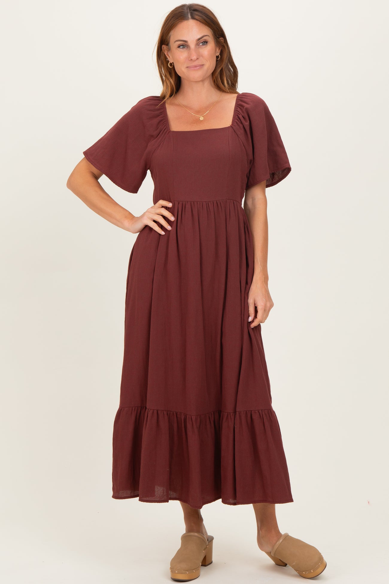 Burgundy Gingham Square Neck Ruffle Midi Dress