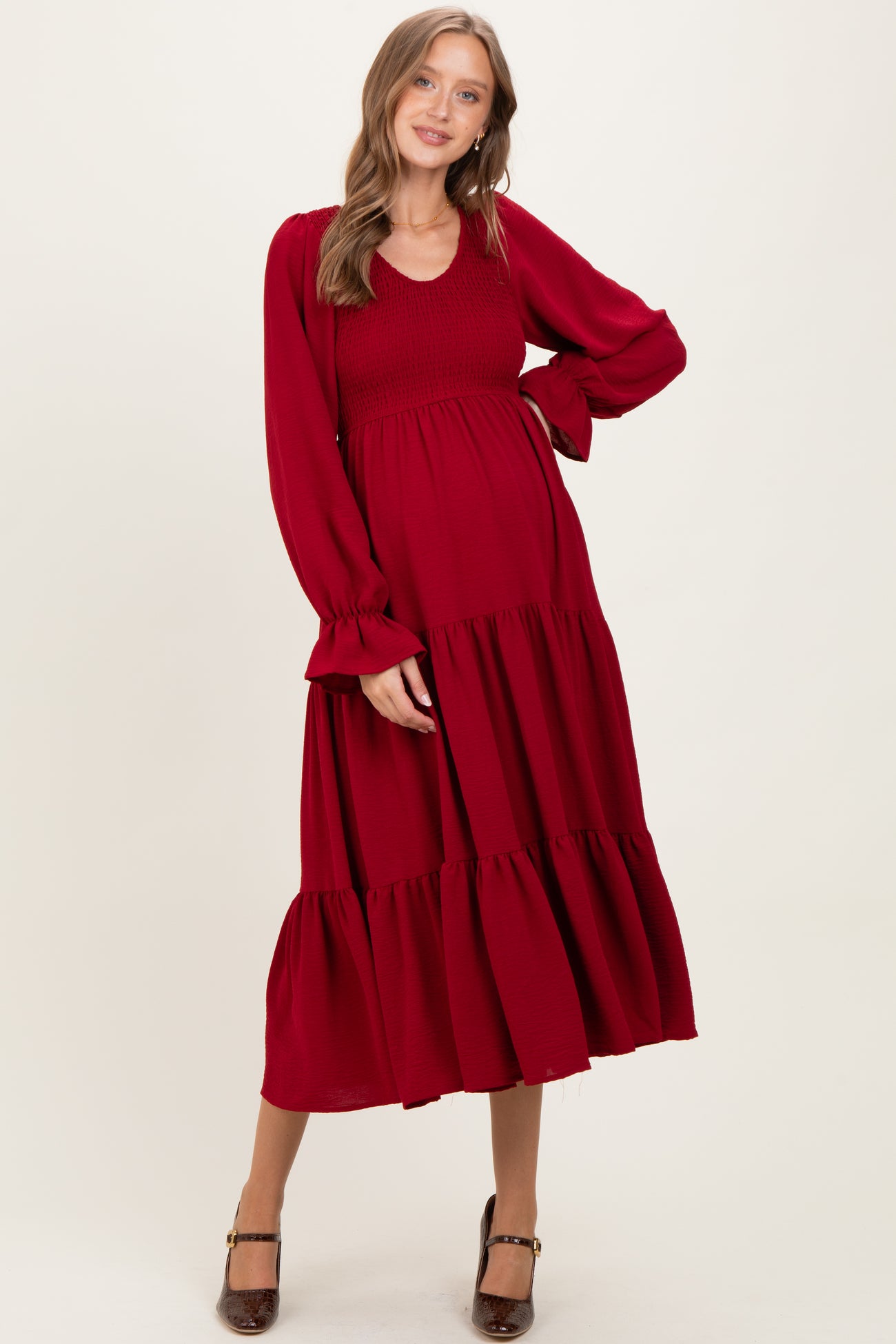 Burgundy Smocked Tiered Long Sleeve Maternity Maxi Dress