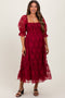 Burgundy Velvet Button Accent Smocked Sleeve Maternity Midi Dress