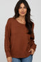 A knit maternity sweater featuring long braided sleeves and a rounded neckline.