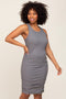 A ribbed sleeveless maternity dress featuring side ruching and a rounded neckline.
