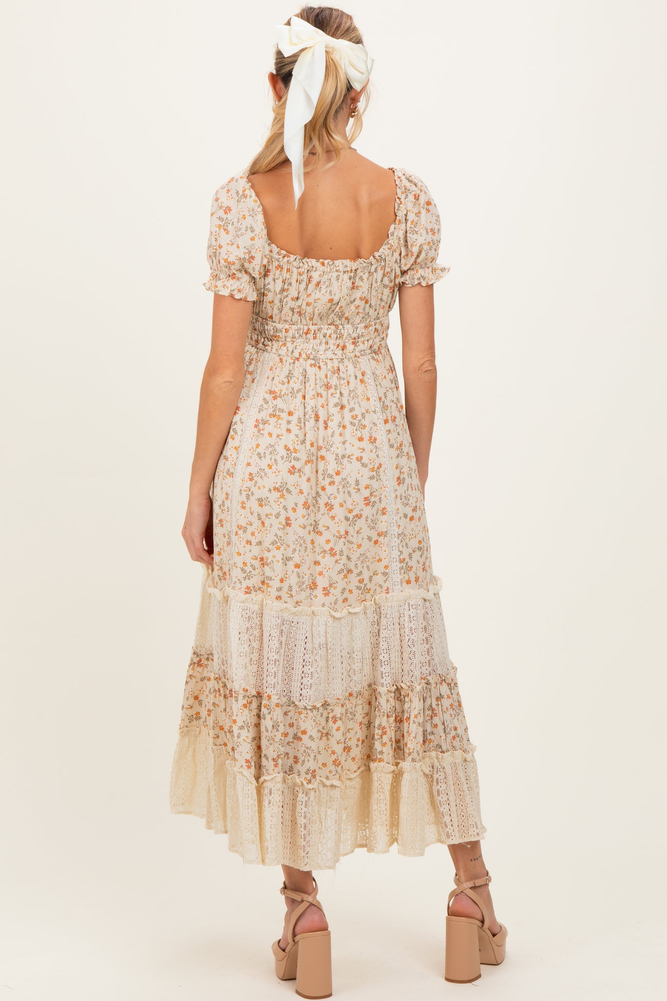 Cream Floral Lace Inset Puff Sleeve Maternity Maxi Dress