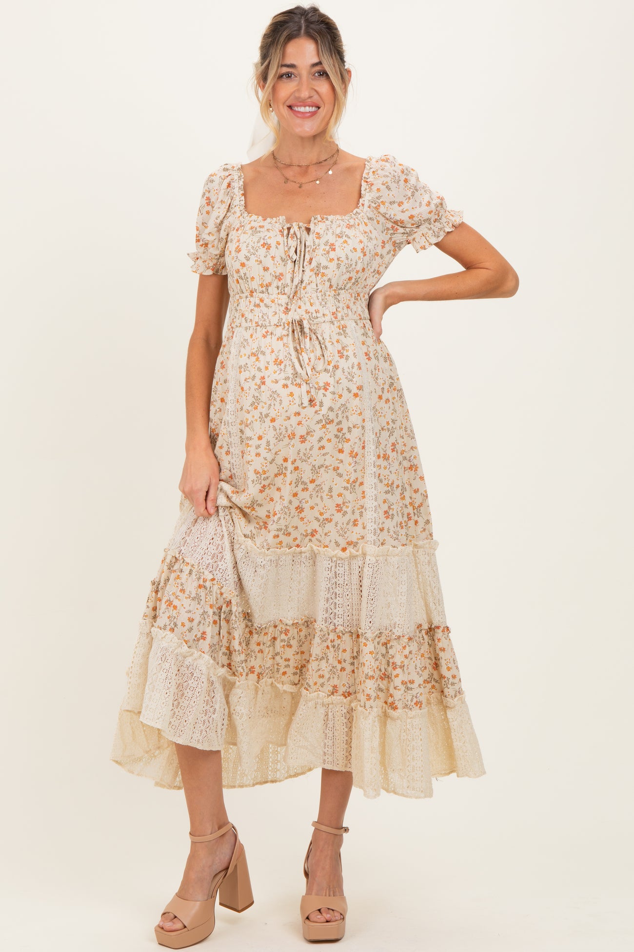 Embrace timeless elegance with our Cream Floral Lace Inset Puff Sleeve Maternity Maxi Dress. Crafted with soft, breathable fabric featuring a delicate cream base adorned with charming floral prints, this dress is designed for comfort and style throughout your pregnancy. The puff sleeves and square neckline add a romantic touch, while the lace insets and tiered maxi skirt offer a graceful flow that moves with you. Adjustable ties at the bust and empire waist gently accentuate your growing bump. Perfect for special occasions or everyday wear, this dress combines femininity and comfort effortlessly. Pair it with sandals or heels for a stunning maternity look.