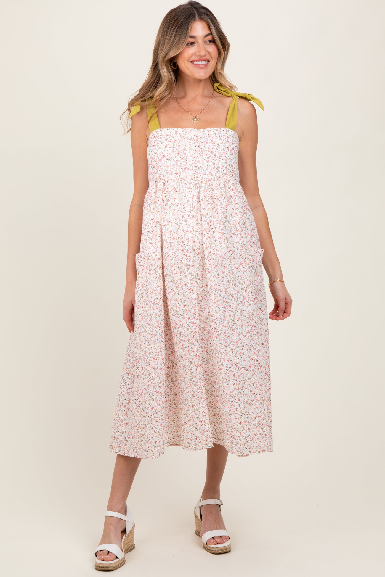 Cream Floral Shoulder Tie Button Down Maternity Midi Dress