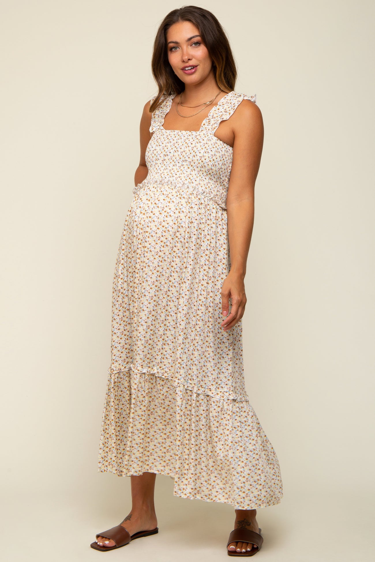 Cream Floral Sleeveless Smocked Ruffle Maternity Midi Dress