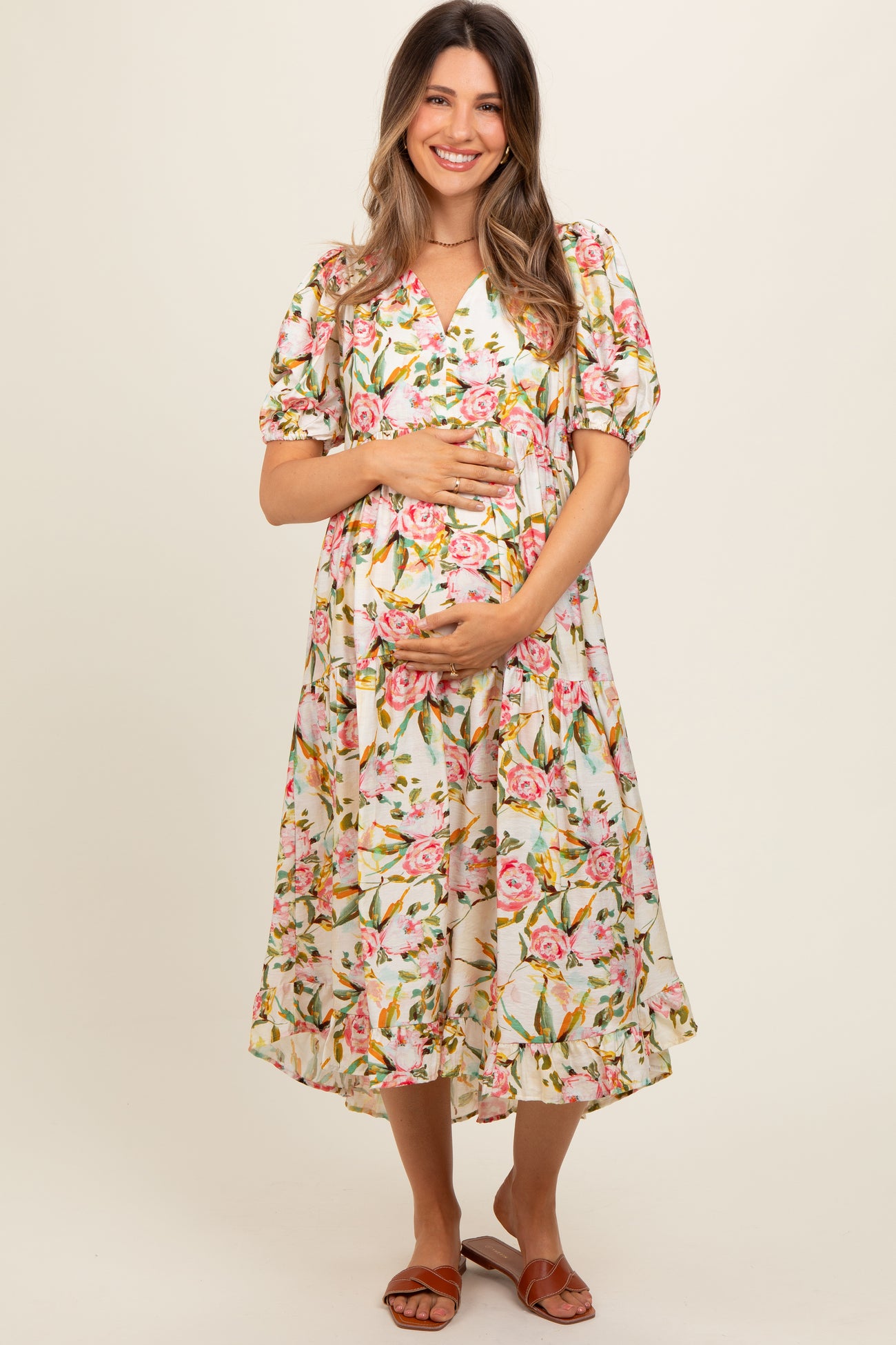 Cream Floral V-Neck Tiered Maternity Midi Dress