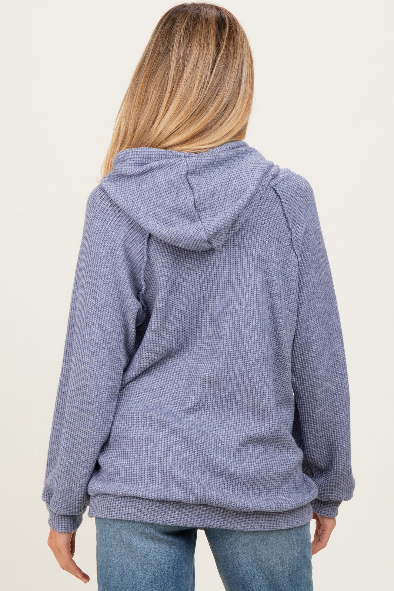 Stay cozy and stylish throughout your pregnancy with our Denim Blue Long Sleeve Solid Maternity Hoodie Top. Crafted from a soft, waffle-knit fabric, this hoodie offers gentle warmth and breathable comfort while adapting to your growing bump. The relaxed fit and adjustable drawstring hood provide effortless casual chic, perfect for everyday wear. Featuring ribbed cuffs and a convenient kangaroo pocket, it combines function with fashion. Pair it seamlessly with your favorite maternity jeans or leggings for a laid-back, comfortable look. Machine washable for easy care, this hoodie is a must-have addition to your maternity wardrobe.