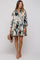 A satin printed maternity dress with a collar, front functioning buttons, side pockets, and long puff sleeves with smocked cuffs.