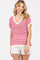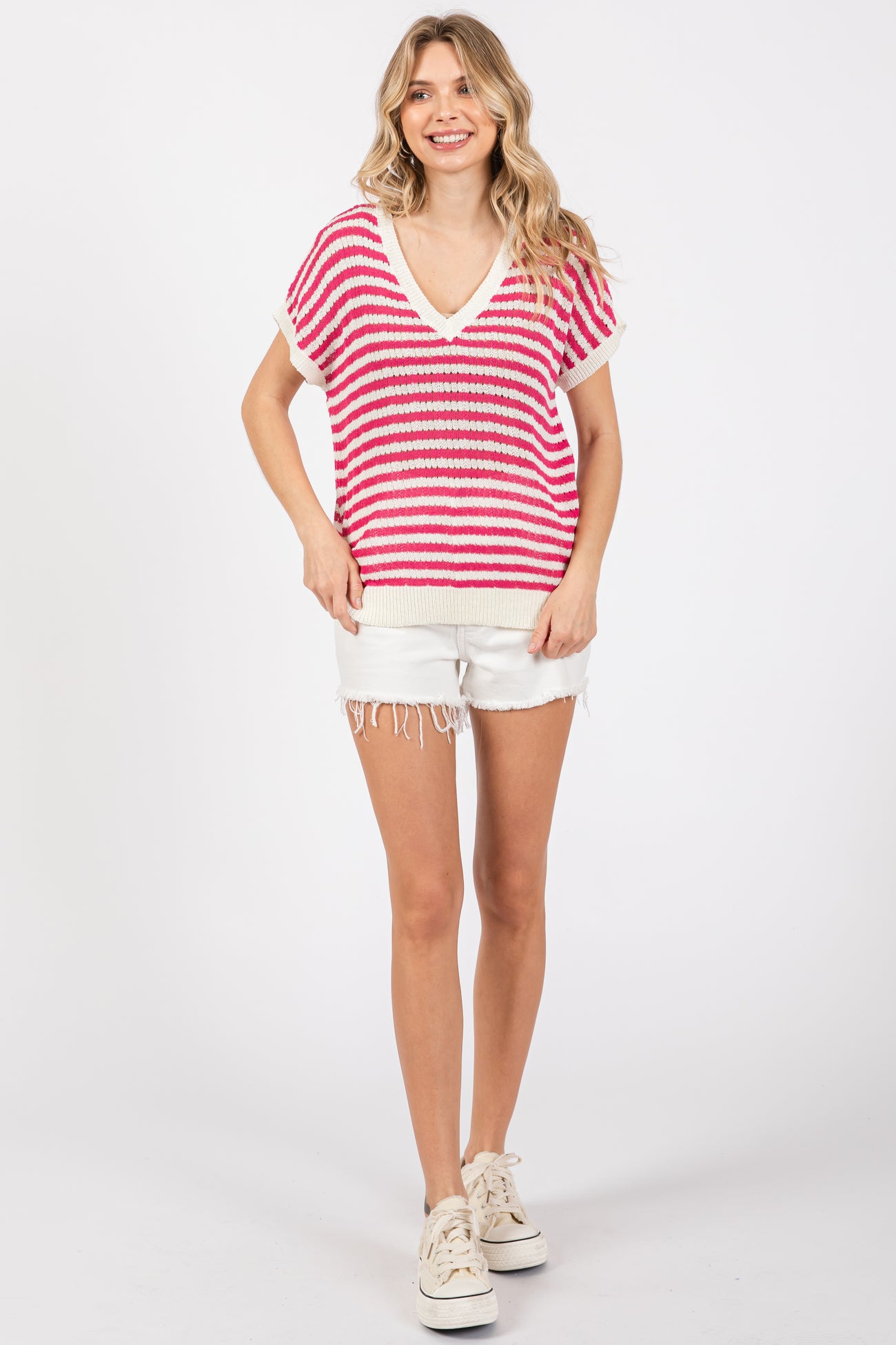 Fuchsia Striped Knit V-Neck Short Sleeve Top