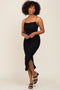 A solid maternity midi dress featuring a swiss dot texture, 3/4 sleeves, a smocked top and a ruffle square neckline.