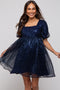 A sequin and pearl embellished maternity dress featuring a square neckline, short puff sleeves, an empire waist, a side zipper, an A-line skirt with tulle and double lining.