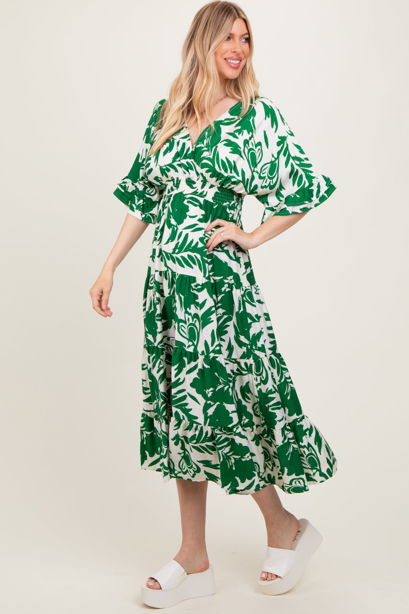 Green Abstract Floral V-Neck Tiered Midi Dress