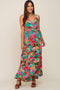 A floral dress with adjustable straps, a wrap v-neck top with a snap button closure, an elastic waist, and a hi-lo hem. Dress is partially lined.