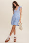 A floral pleated maternity dress that features a mock neckline and a back neck tie.