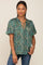 A printed blouse top. Features a ruffle accent neckline, a front tie, a v-neckline, and short puff sleeves.