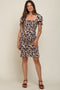 A solid dress that features a squared neckline, short puff sleeves, a smocked top, and a ruffle accent layered hem.