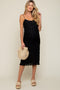 A satin solid hue midi dress with long puff sleeves, smocked accents at the shoulder, a wrap v-neckline with a snap button closure, and an elastic waist.