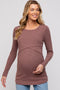 A solid brushed knit rib maternity long sleeve top with a layered crossover top for nursing access.