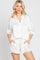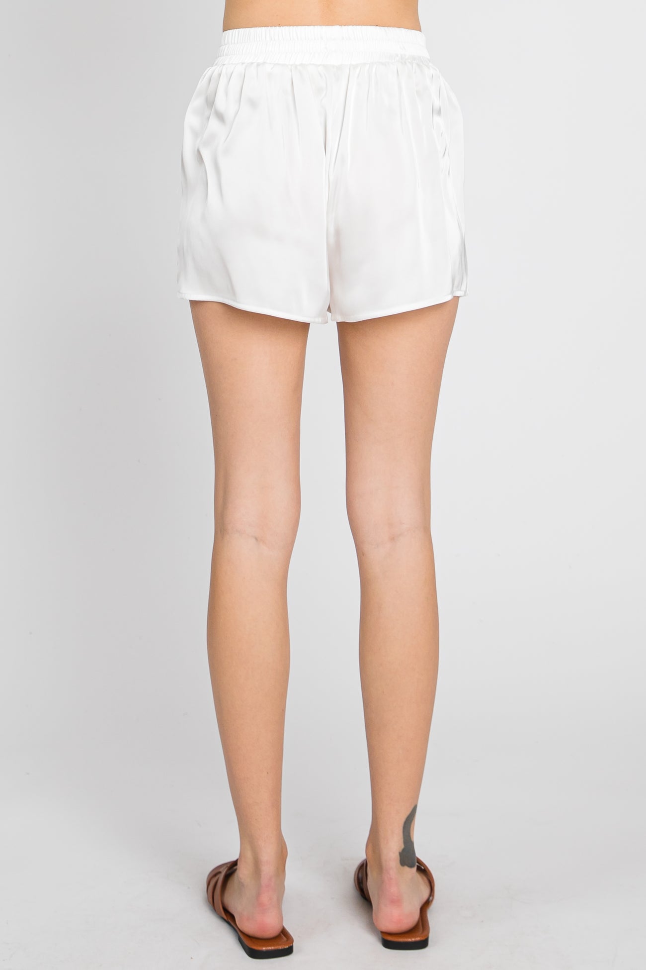 A satin set with a button up and shorts. The button up features a collar, long cuffed sleeves, and a rounded hem. The shorts feature a smocked elastic waist, a front tie, and front pockets.
