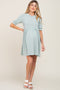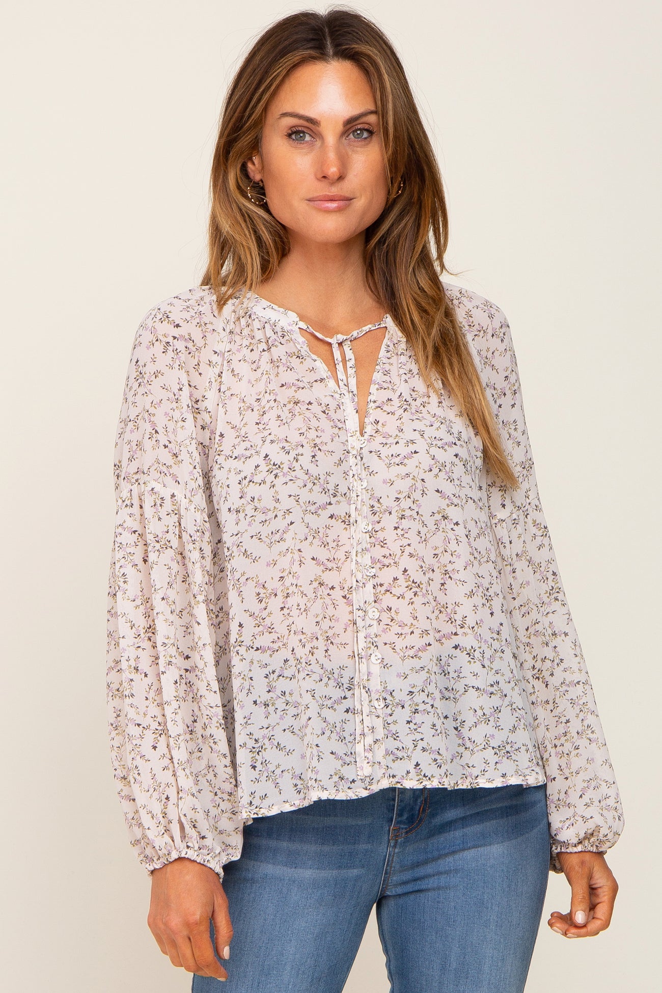 A floral maternity blouse with long balloon sleeves, a front neck tie, and front button accents. Top is semi sheer.