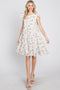 A floral printed and embroidered maternity dress with short cap sleeves, a rounded neckline, a tiered skirt, and a back keyhole closure. Dress is lined to prevent sheerness.