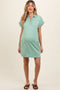 An ultra-soft knit maternity midi dress featuring a boat neckline, short sleeves, a tie at the waist, ruched sides with side slits and fully double lined.