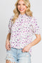 A floral maternity blouse featuring a smocked mock neckline, ruffle puff sleeves and a back keyhole cutout with a button closure.