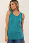A light wash maternity denim jacket. Features heavy distressing and cropped length. Decorative pockets in front.