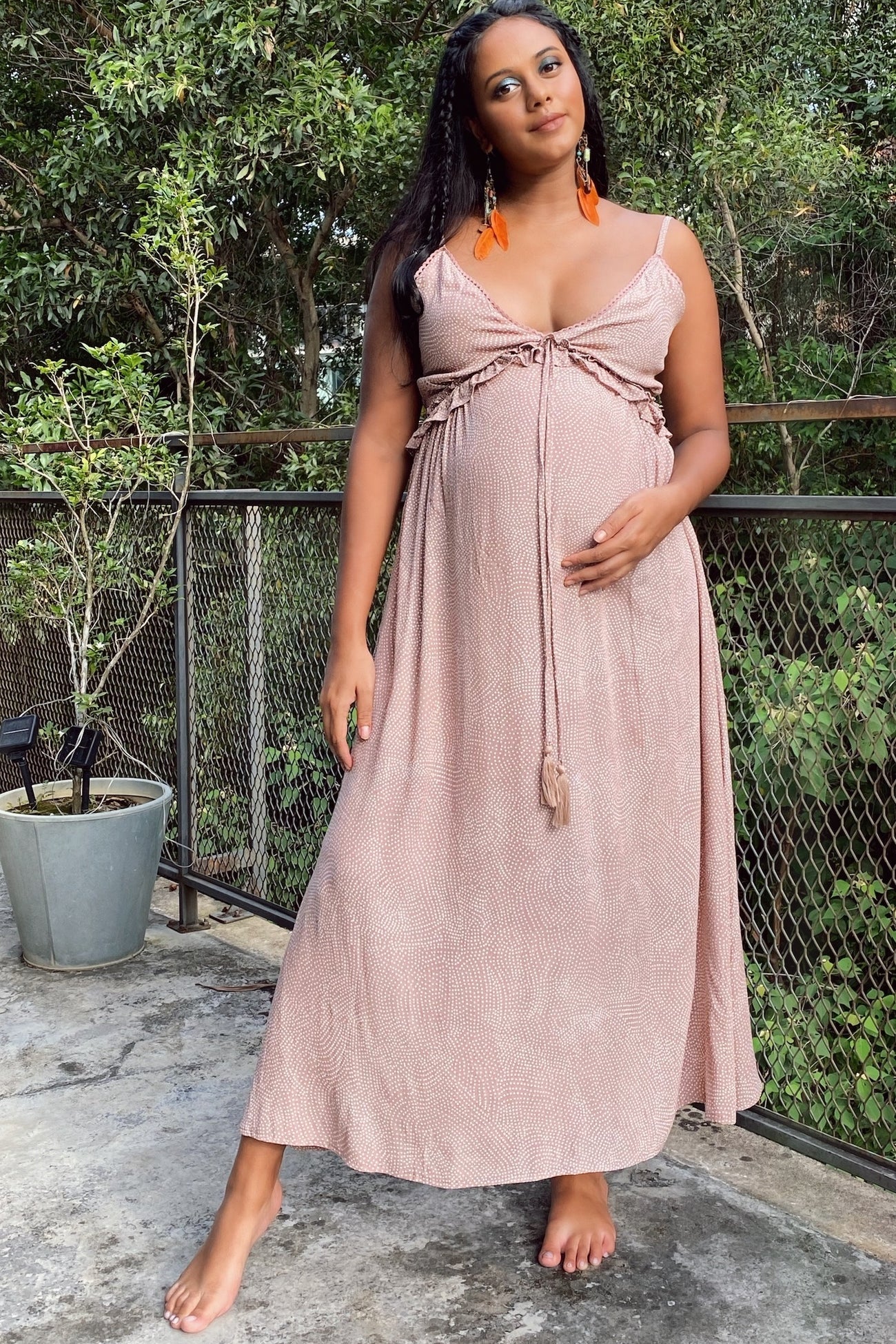 Details A dot print maternity midi dress featuring ruffle, crochet lace and self tie detail in front, smocked back and adjustable thin straps. Content + Care