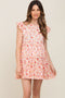 A floral mini dress with a rounded neckline, ruffle accent at the sleeve openings, side pockets, a gathered bottom tier, and a back tie.