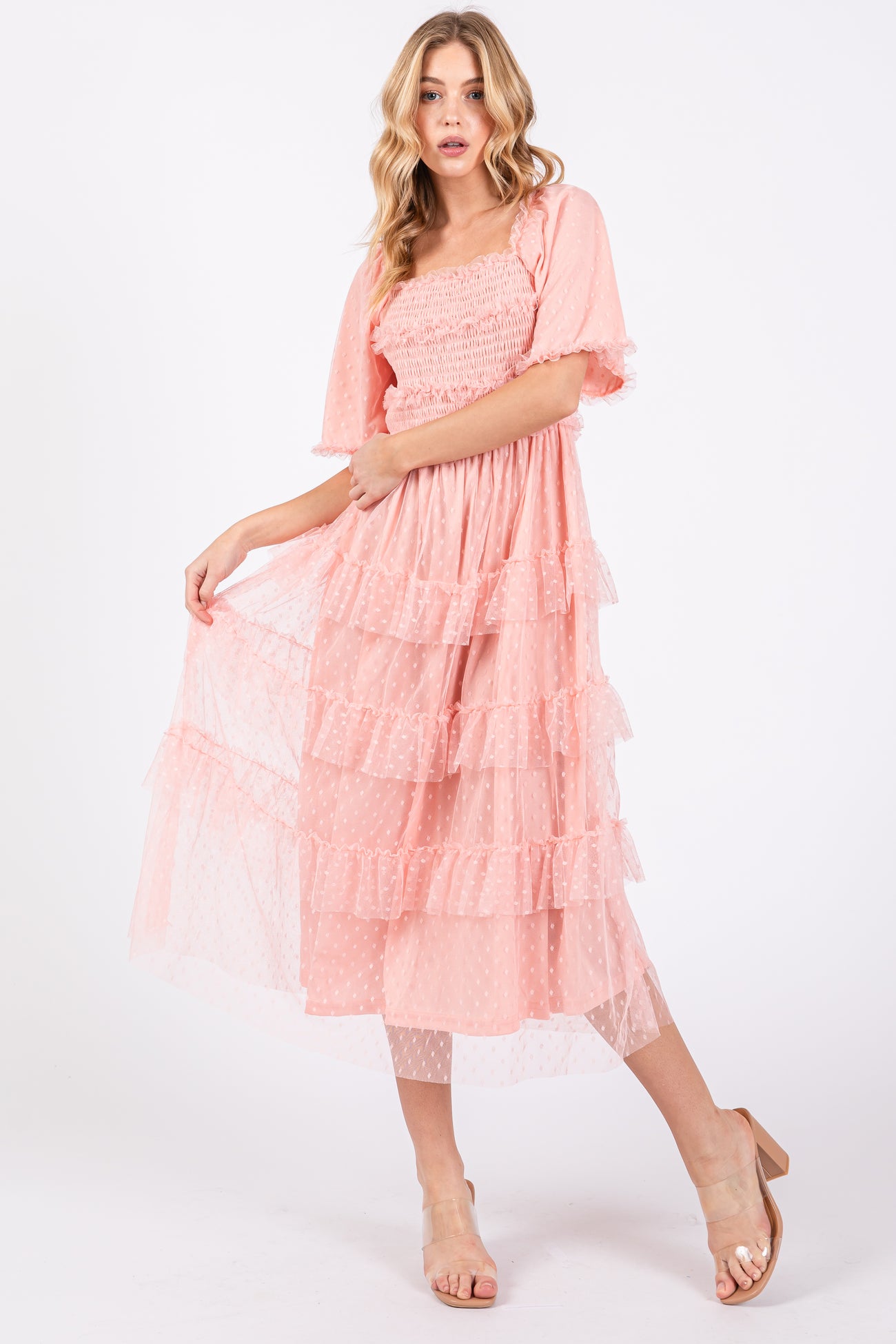 Light Pink Dot Smocked Ruffle Tiered Maternity Midi Dress