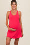 A soft knit maternity tennis romper dress. Features a scoop neckline, a racerback with a cutout, removable cups, an elastic band under the bust, and side pockets on the shorts.