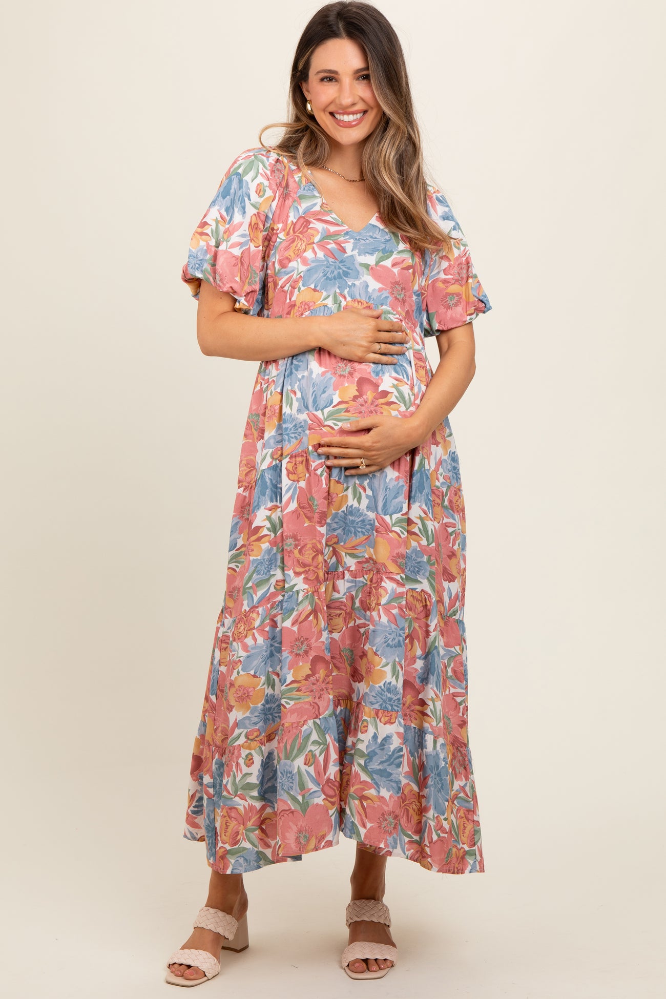Mauve Floral Print Pocketed Maternity Midi Dress