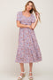 A floral printed maternity midi dress featuring a smocked, adjustable cinched top, a sweetheart neckline, short puff sleeves, and a gathered bottom tier.
